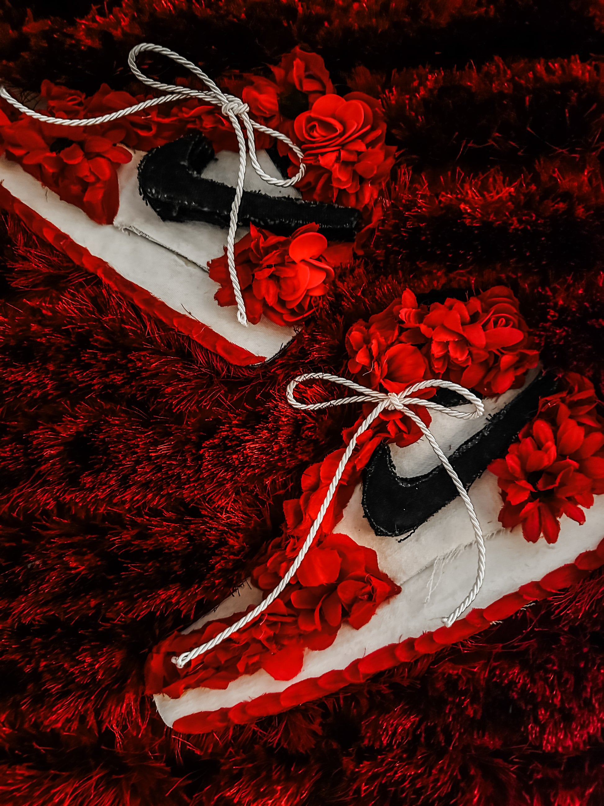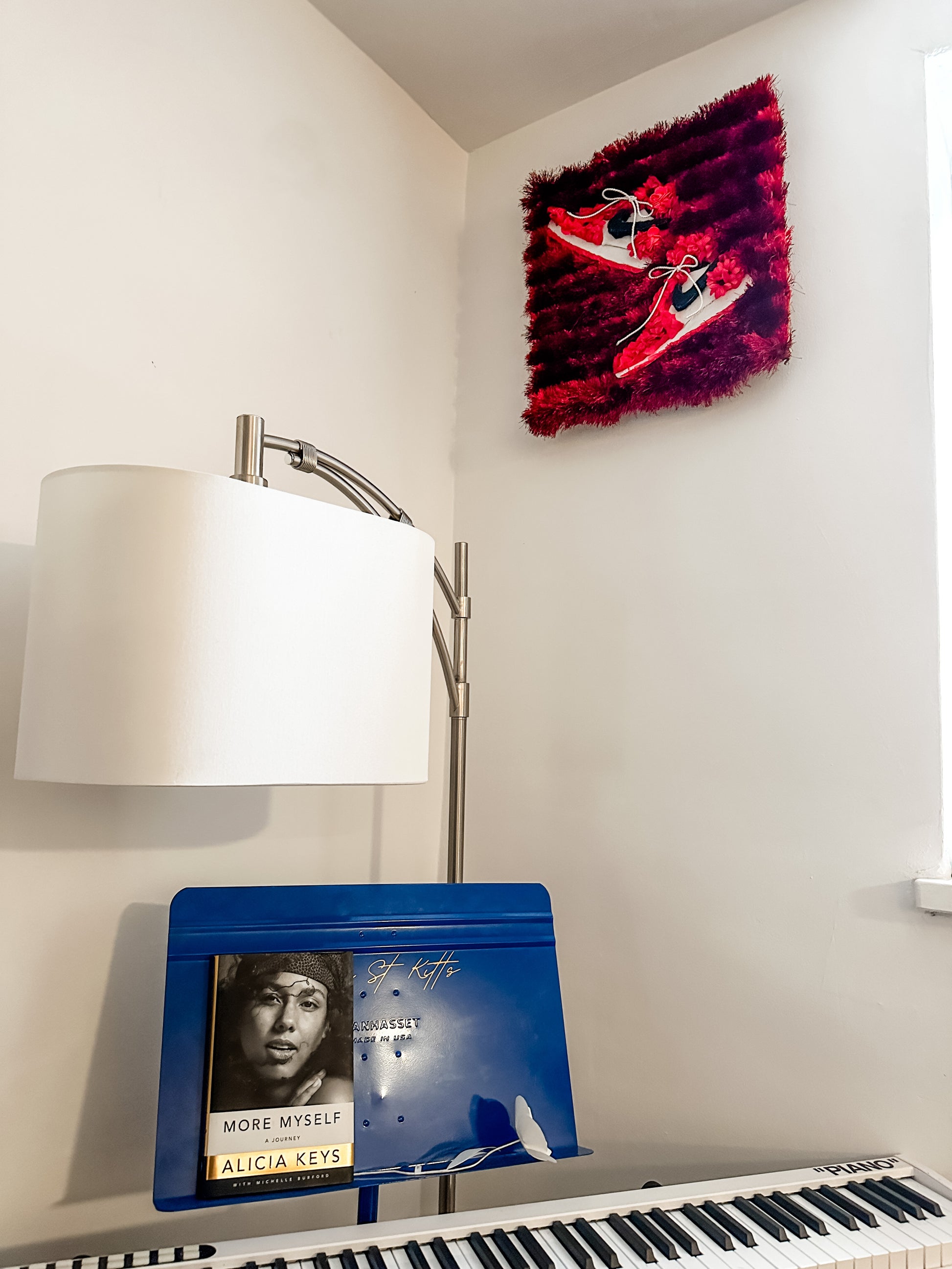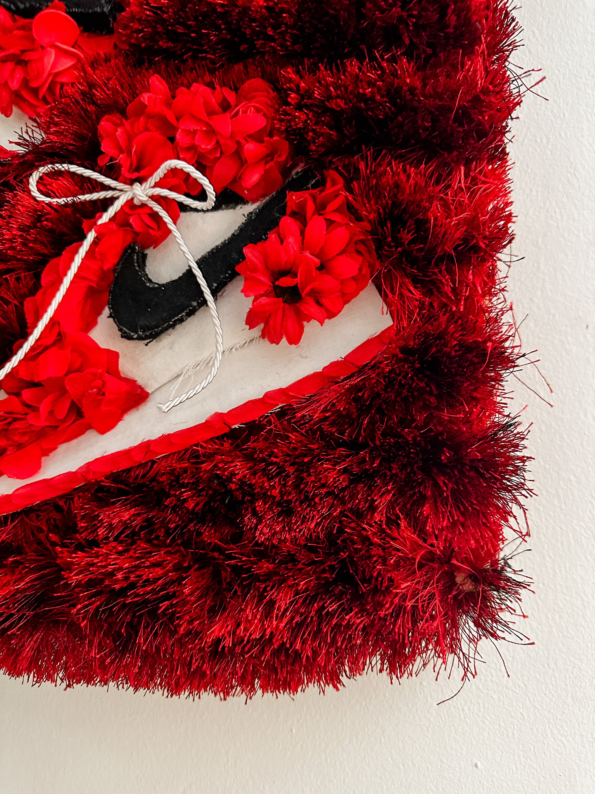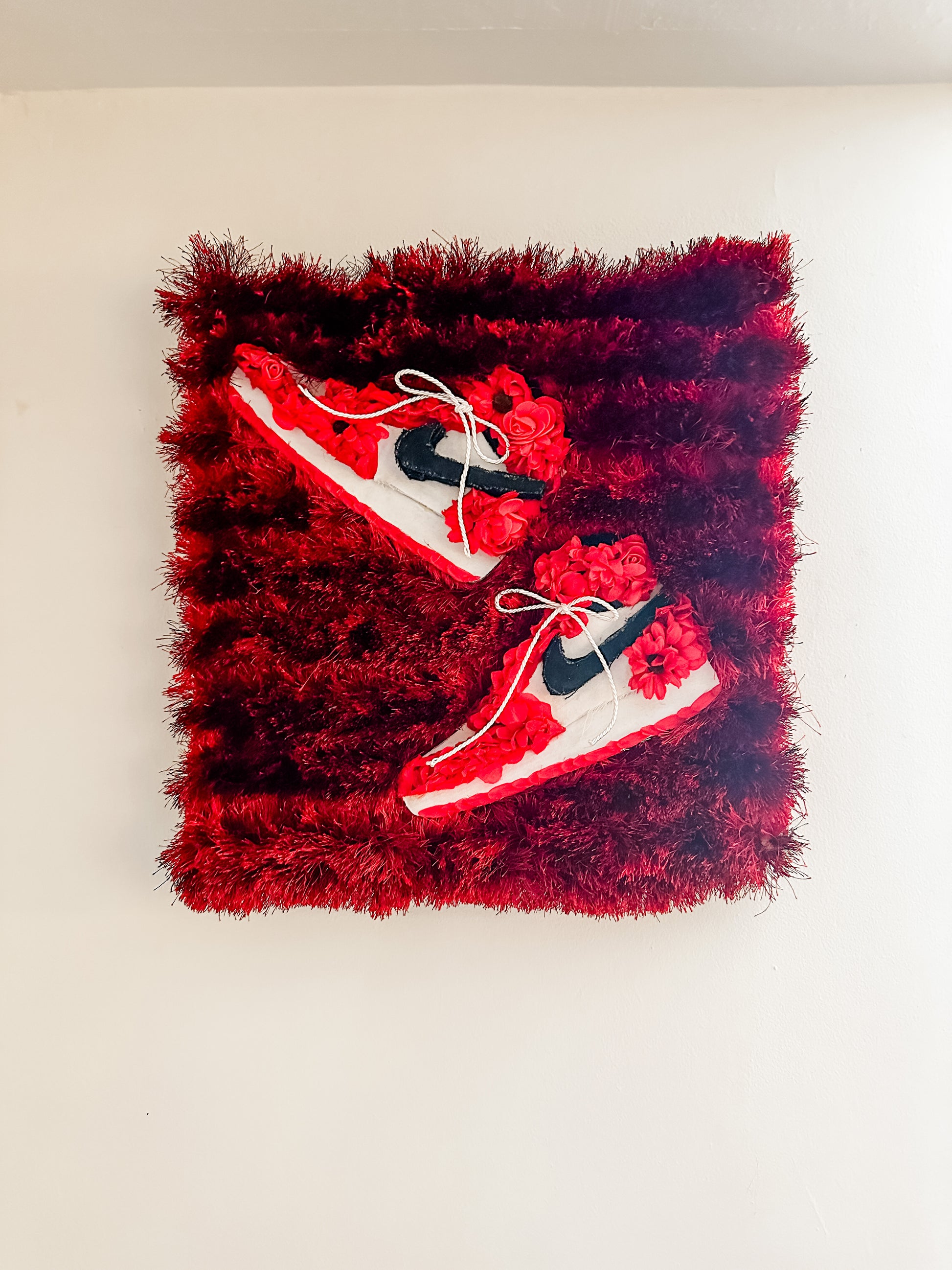 This 20”x20” piece is sleek and 1 of 1. This iconic sneaker is a personal fave for many  #sneakerheads everywhere ❤️🤩 With an emphasis of diversifying textiles, it features upcycled carpet (with a high pile which is why it’s so fluffy!), silk flowers, repurposed denim and wood making it unique, modern and  stylish.