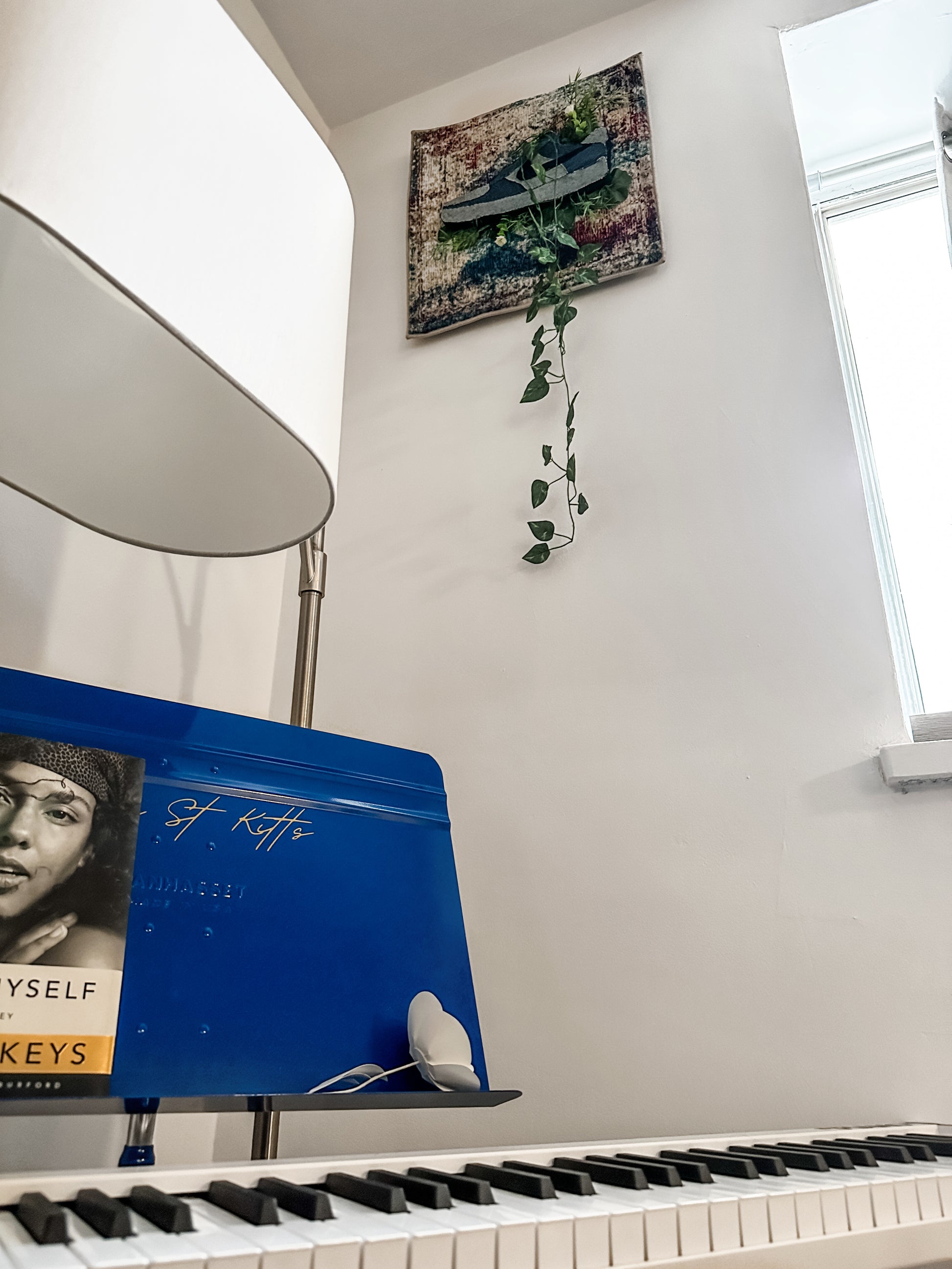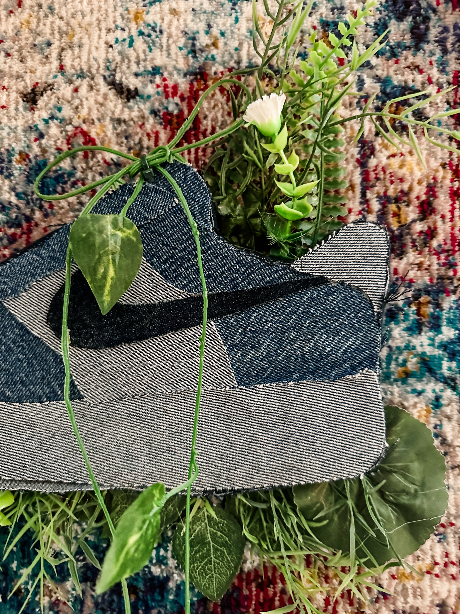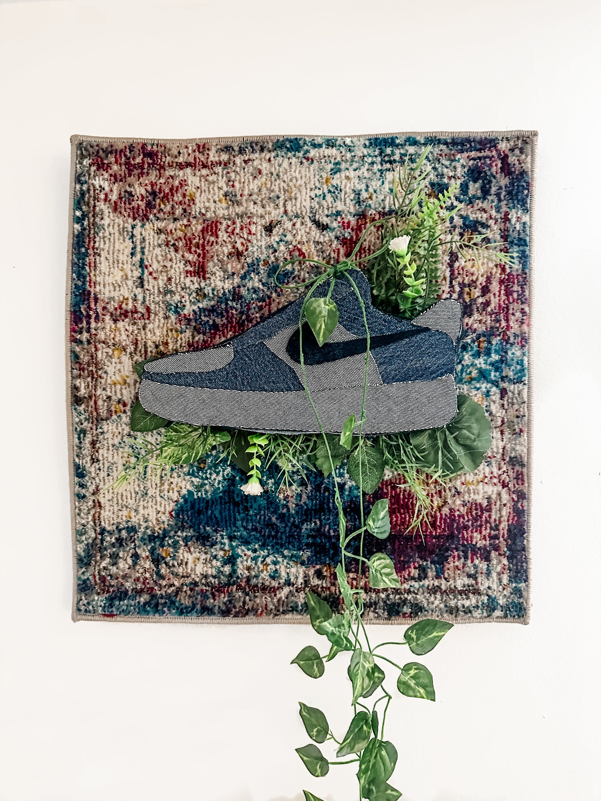 Denim Dream 2.0 is definitely something special! This 20”x20” piece is sleek and 1 of 1. With an emphasis of diversifying textiles, it features upcycled carpet, denim and wood making it unique, modern and stylish with hanging vines that bring it to life.