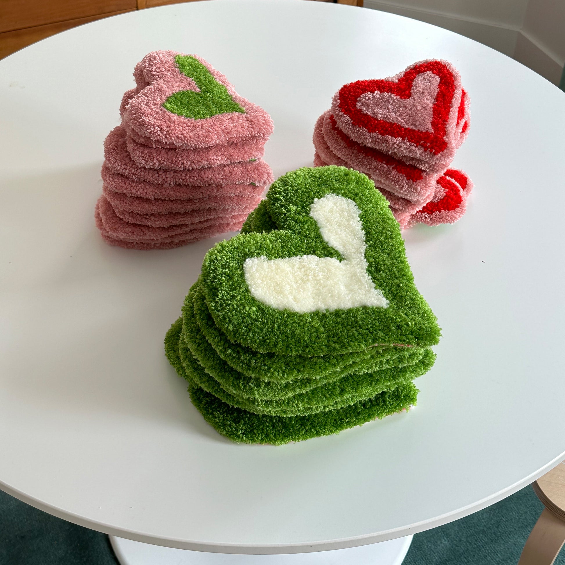 Hand tufted set of 3 heart BB's for you to hang anywhere in your home or use as a coaster for your favourite things. Made with 100% acrylic yarn.